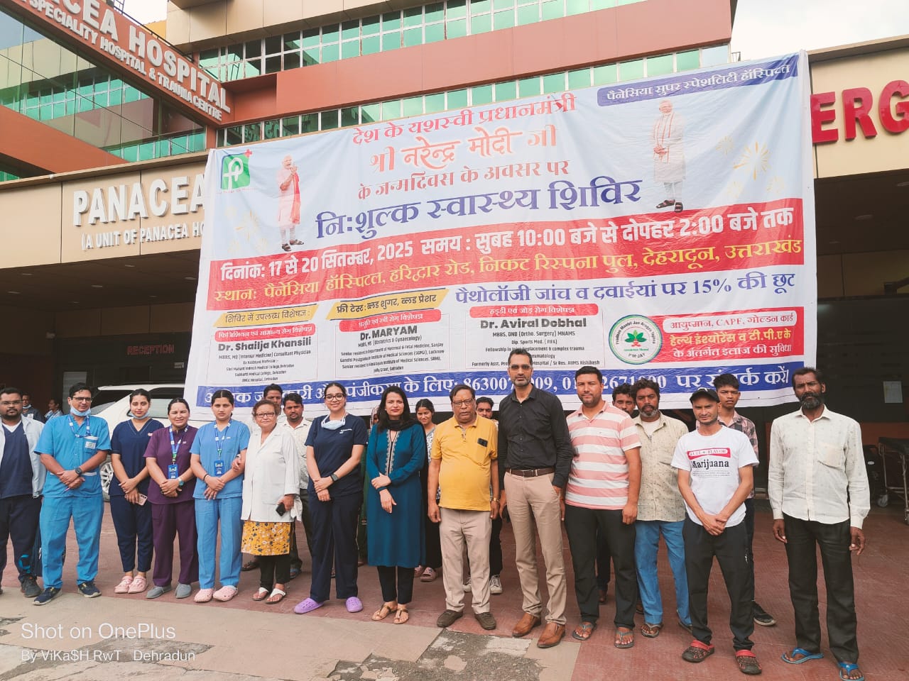 देहरादून: पैनेसिया सुपर स्पेशलिटी हॉस्पिटल द्वारा हमारे देश के यशस्वी प्रधानमंत्री नरेंद्र मोदी के जन्मदिवस के उपलक्ष्य में “मानवता की सेवा के पथ पर” विशेष निःशुल्क स्वास्थ्य शिविर का आयोजन किया गया। यह शिविर अस्पताल परिसर में 17 से 20 सितम्बर तक आयोजित किया गया है। शिविर में पहले दिन कुल 246 रोगियों ने परामर्श एवं उपचार प्राप्त किया। शिविर में विशेषज्ञ चिकित्सकों की टीम ने लोगों को परामर्श और उपचार प्रदान किया।